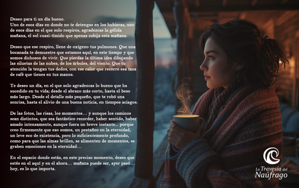 Deseo que ese respiro, llene de oxígeno tus pulmones. Que una bocanada te demuestre que estamos aquí, en este tiempo y que somos dichosos de vivir. Que pierdas la última idea dibujando las siluetas de las nubes, de los árboles, del viento. Que tu atención la tengan tus dedos, con ese calor que recorre esa taza de café que tienes en tus manos.