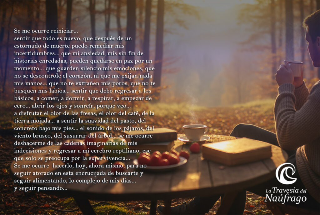 sentir que todo es nuevo, que después de un estornudo de muerte puedo remediar mis incertidumbres… que mi ansiedad, mis sin fin de historias enredadas, pueden quedarse en paz por un momento… que guarden silencio mis emociones, que no se descontrole el corazón, ni que me exijan nada mis manos… que no te extrañen mis poros, que no te busquen mis labios… sentir que debo regresar a los básicos, a comer, a dormir, a respirar, a empezar de cero… abrir los ojos y sonreír, porque veo… a disfrutar el olor de las fresas, el olor del café, de la tierra mojada… a sentir la suavidad del pasto, del